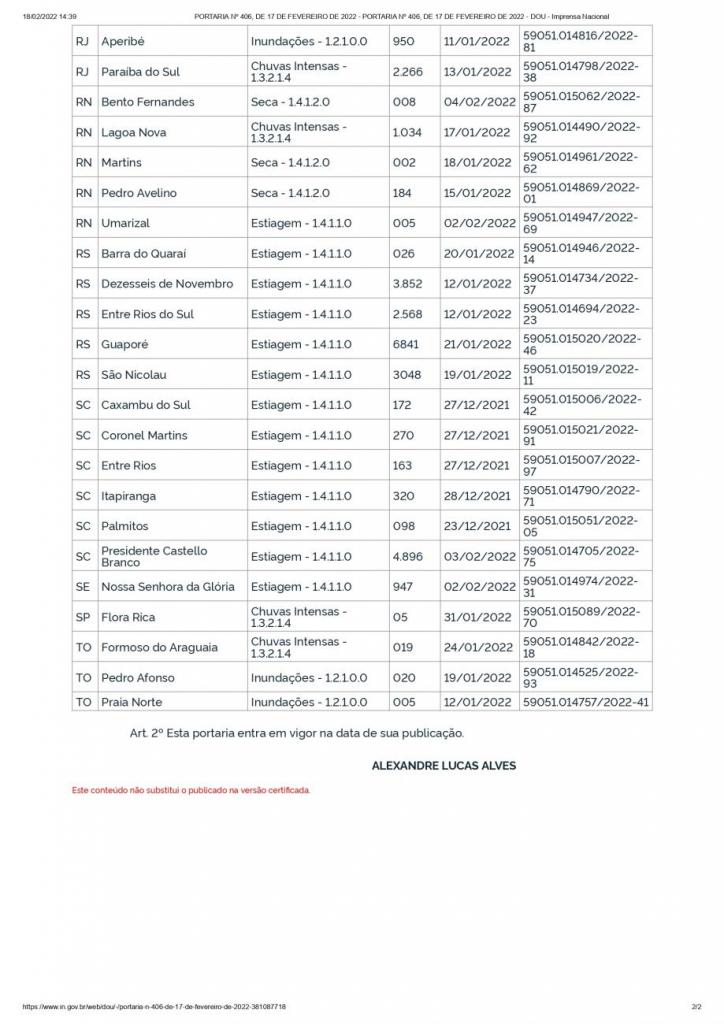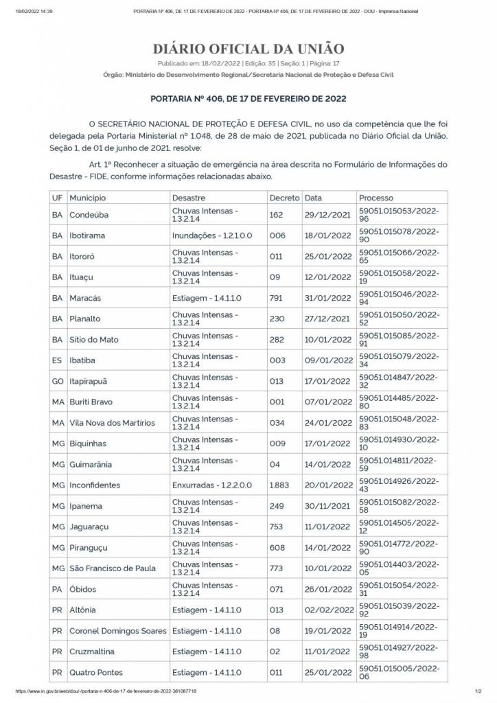 Publicada hoje (18) no Diário Oficial da União, a portaria nº 406, de 17 de fevereiro de 2022, reconhece a situação de emergência por estiagem no Município de Quatro Pontes, conforme descrita no Formulário de Informações do Desastre (FIDE). O reconhecimento foi feito pelo secretário nacional de Proteção e Defesa Civil, Alexandre Lucas Alves.