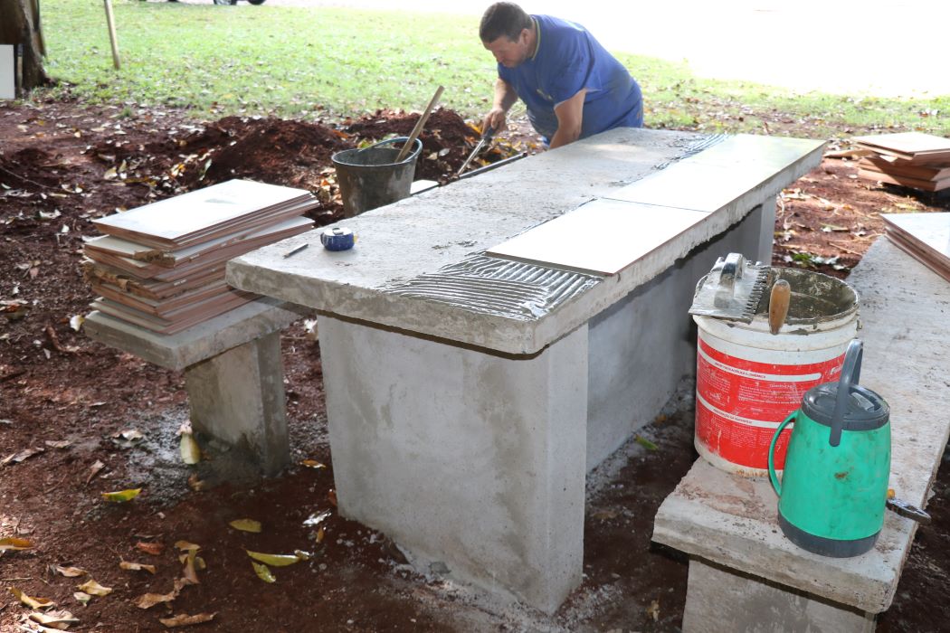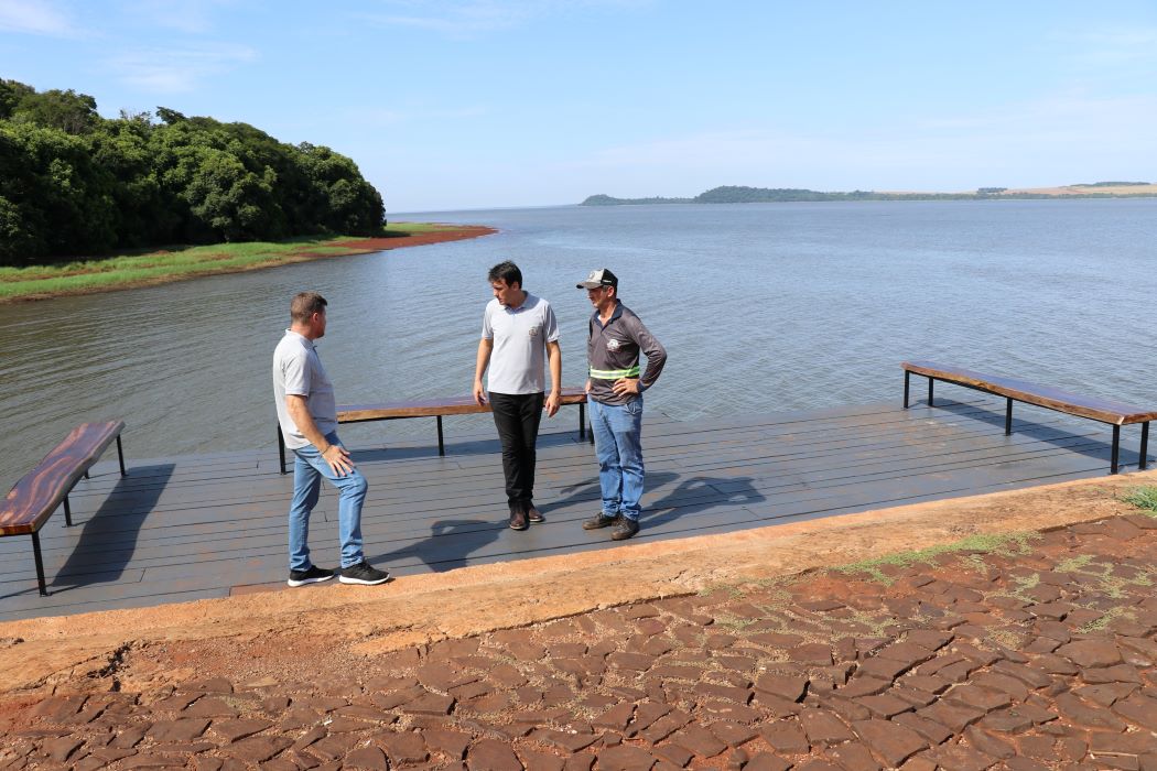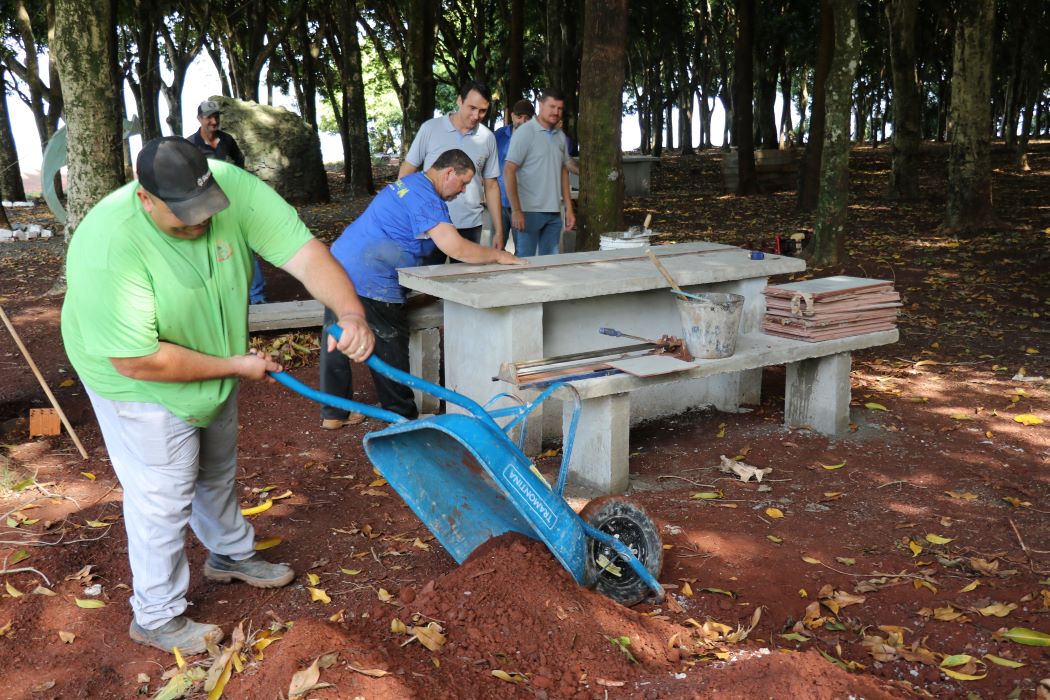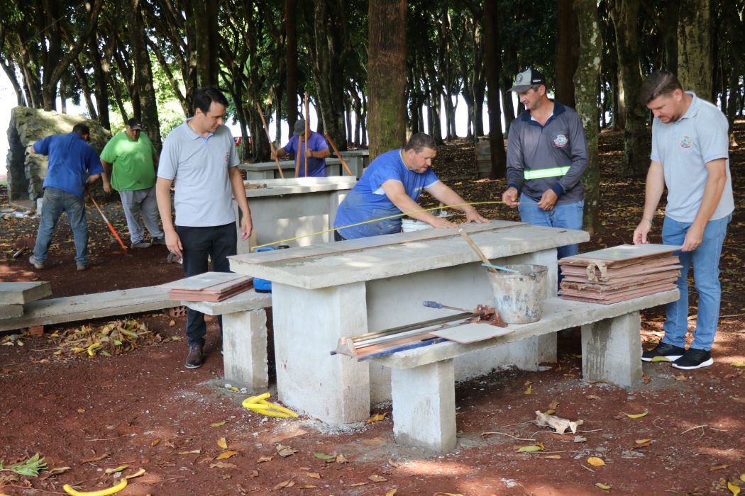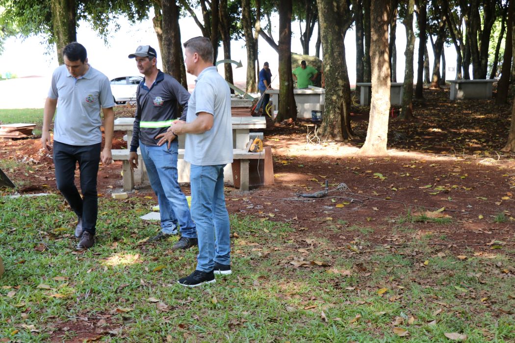 O prefeito em exercício de Pato Bragado, John Nodari, secretário de Planejamento, Lucas Blatt, e o diretor do departamento de Serviços Urbanos, Volnei Lizzoni, acompanharam na última sexta-feira (9), os trabalhos de construção de bancos e mesas de concreto com revestimento cerâmico, na área de lazer do Porto Britânia. O local pertence à Itaipu Binacional e está cedido ao município em sistema de comodato.