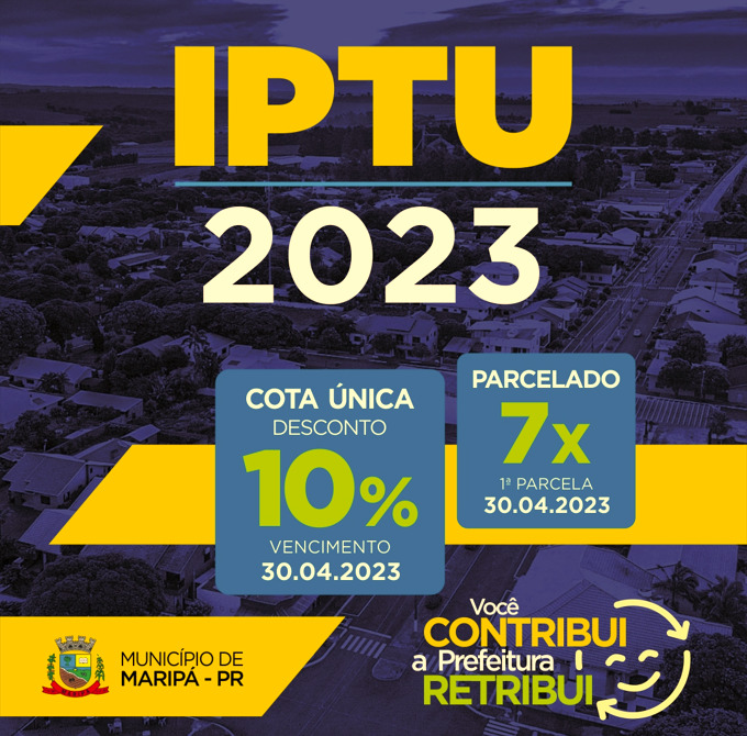 Os contribuintes também podem fazer a impressão do Imposto Predial e Territorial Urbano (IPTU) 2023 no site do Município de Maripá. As guias podem ser impressas e pagas em qualquer agência bancária ou lotérica ou pelos aplicativos das agências bancárias com o código de barras.