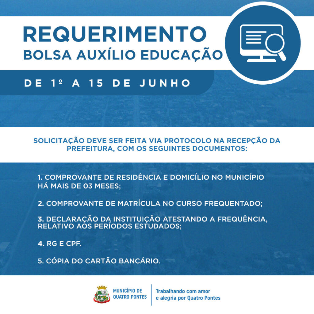 Termina na quinta-feira (15) o prazo para requerimento da Bolsa Auxílio Educação, que deve ser formalizado via protocolo na recepção da Prefeitura de Quatro Pontes para pagamento referente ao primeiro semestre (meses de janeiro a junho). Segundo a lei nº 2764/2023, de 24 de maio de 2023, a Bolsa Auxílio Educação pode ser solicitada por estudantes que frequentam de três a sete dias semanais cursos da educação básica não ofertada no município, sendo Educação de Jovens e Adultos Ensino Fundamental II e Ensino Médio, Ensino Médio no período da noite, curso pré-vestibular, curso superior de graduação ou pós-graduação e curso técnico profissionalizante, e que sejam residentes e domiciliados no município há mais de três meses.