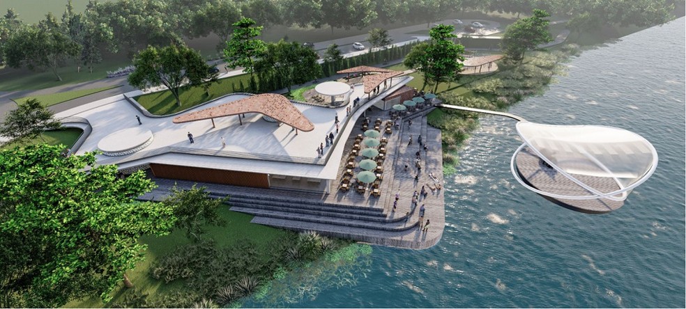 Na orla do lago será implementado um espaço gastronômico com restaurantes e café, além de palco flutuante, playgrounds, portais, academia ao ar livre, entre outros espaços.