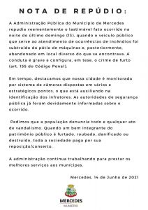 “A Administração Pública do Município de Mercedes repudia veementemente o lastimável fato ocorrido na noite do último domingo (13), quando o veículo público que serve ao atendimento de ocorrências de incêndios foi subtraído do pátio de máquinas e, posteriormente, abandonado em local diverso do que se encontrava. A conduta é grave e configura, em tese, o crime de furto (art. 155 do Código Penal).
