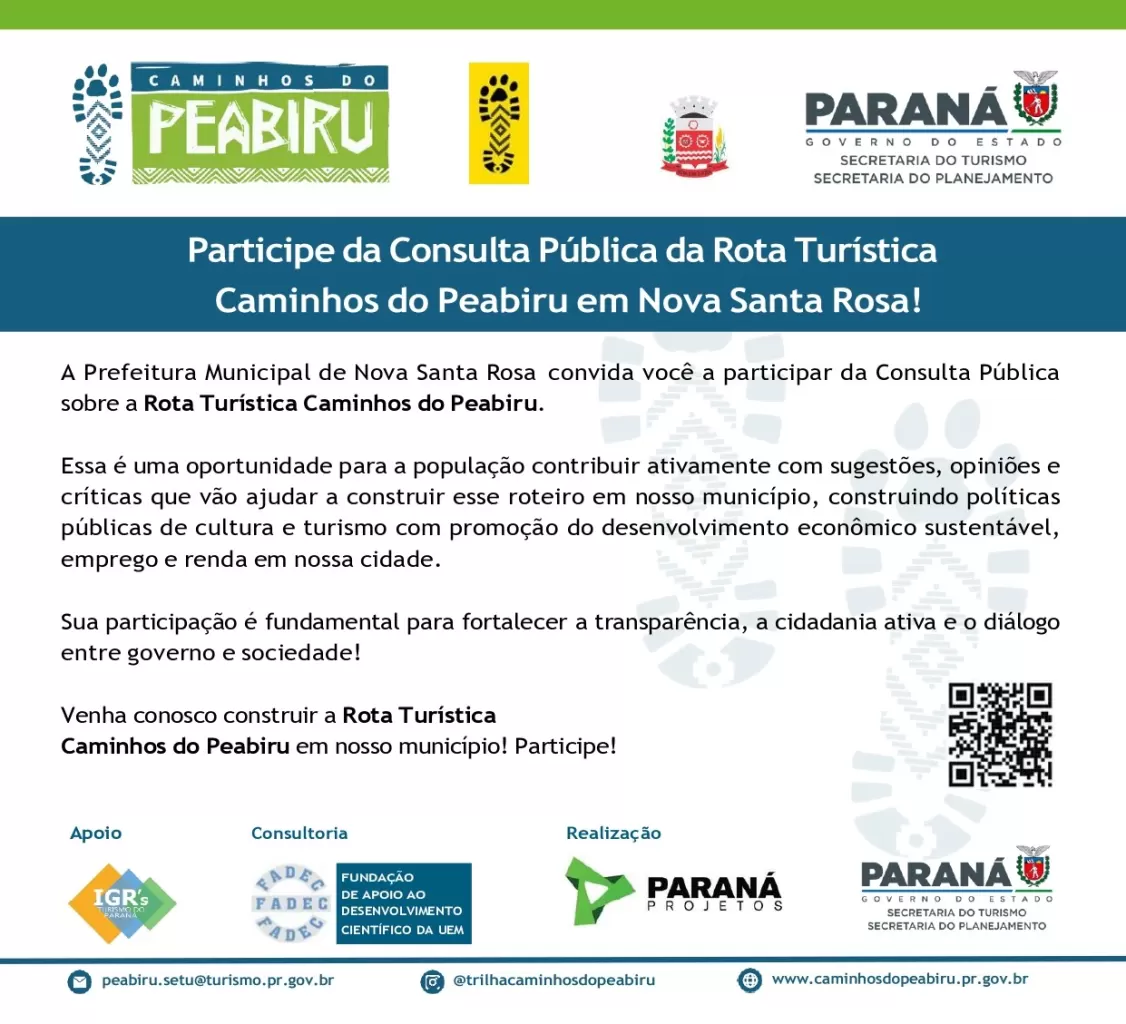 A Prefeitura de Nova Santa Rosa, por meio da Secretaria de Indústria, Comércio e Turismo, convida toda a comunidade a participar da Consulta Pública sobre a Rota Turística Caminhos do Peabiru.