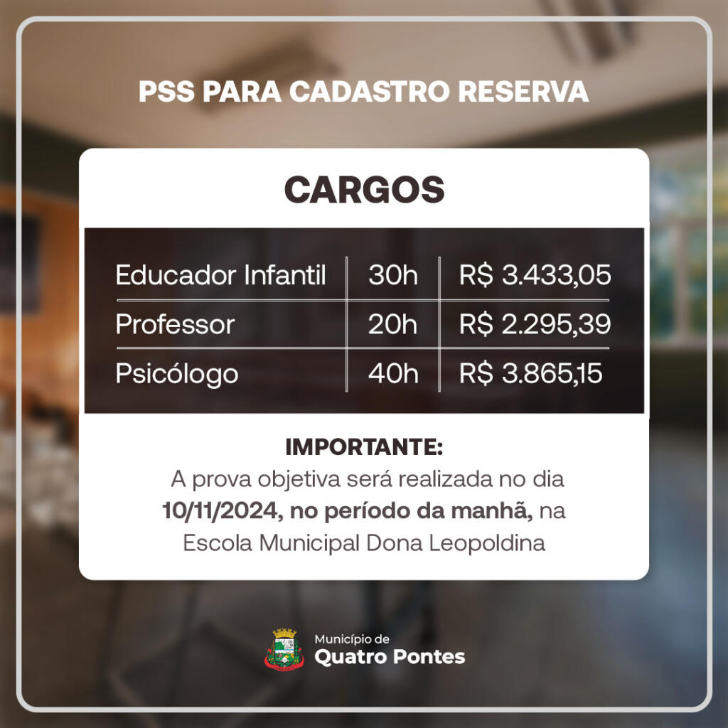 O edital do PSS também está disponível na aba “Concursos”, na lateral direita da página inicial no site oficial do município (www.quatropontes.pr.gov.br).