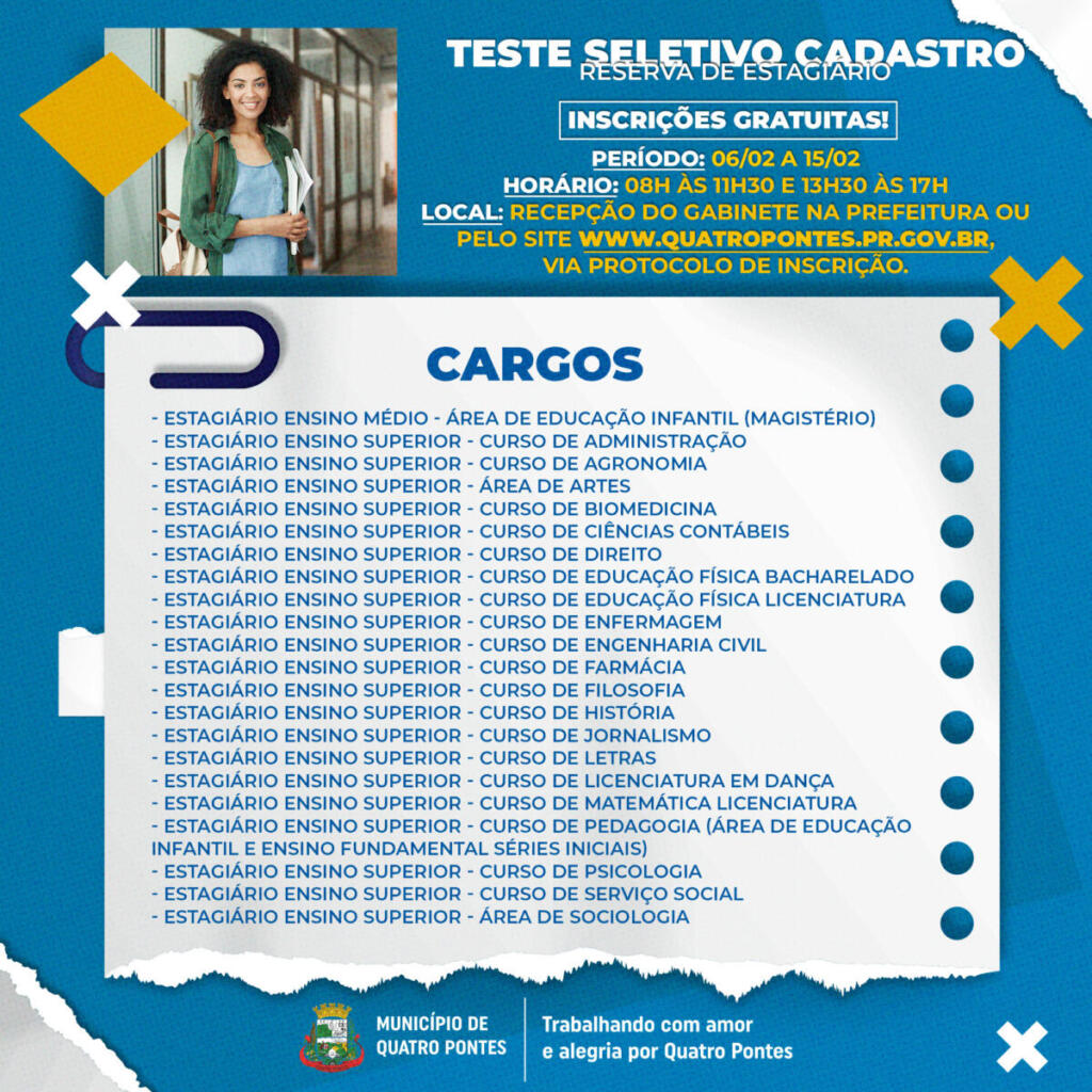 A Prefeitura de Quatro Pontes abriu nesta segunda-feira (06), seguindo até o dia 15, as inscrições do teste seletivo nº 01/2023, de entrega de títulos, para cadastro reserva de estudantes para vagas de estágio no município para complementação educacional em atividades acadêmicas compatíveis com o tipo de formação profissional, oportunizando ao estudante a vivência entre a teoria aprendida e a prática.