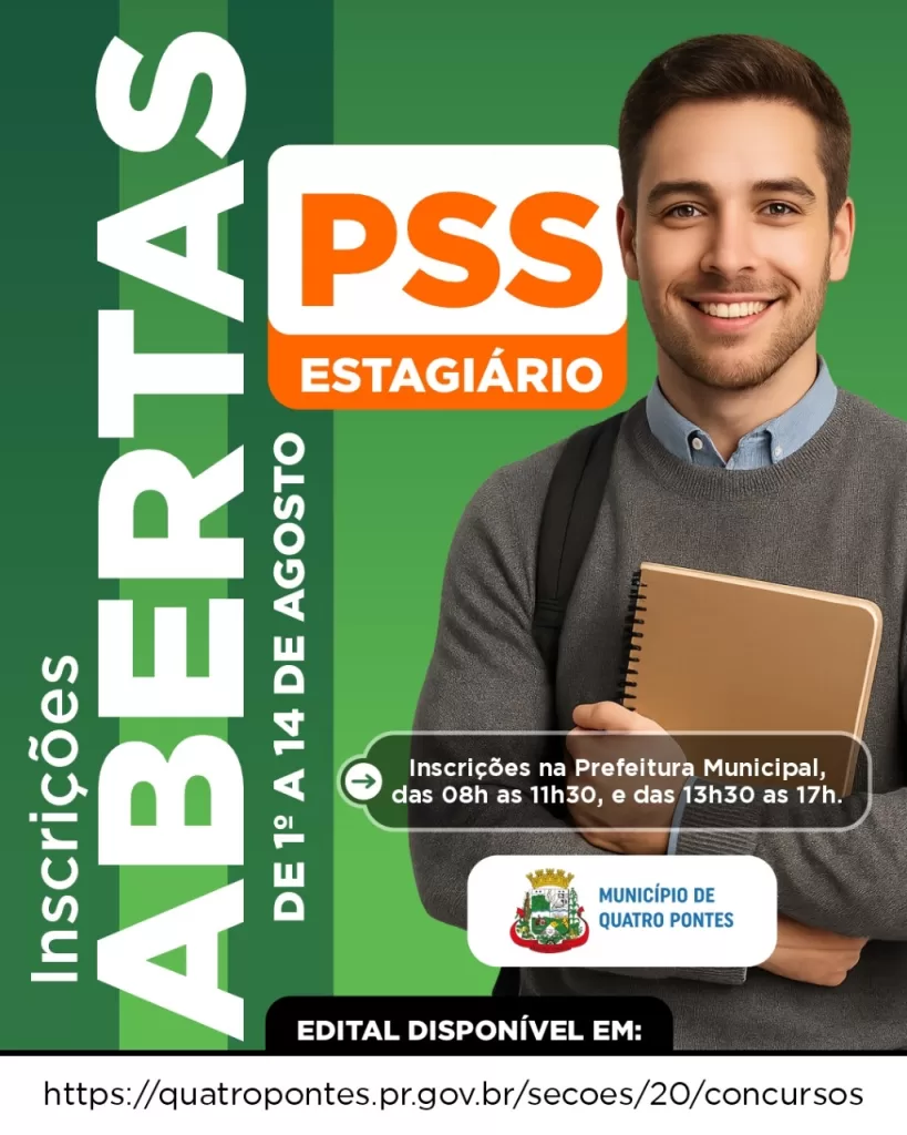 A Prefeitura de Quatro Pontes anuncia a abertura das inscrições para o Processo Seletivo Simplificado (PSS) de estagiários. As vagas são destinadas a estudantes do ensino médio e superior que desejam adquirir experiência profissional em diferentes áreas da administração pública.