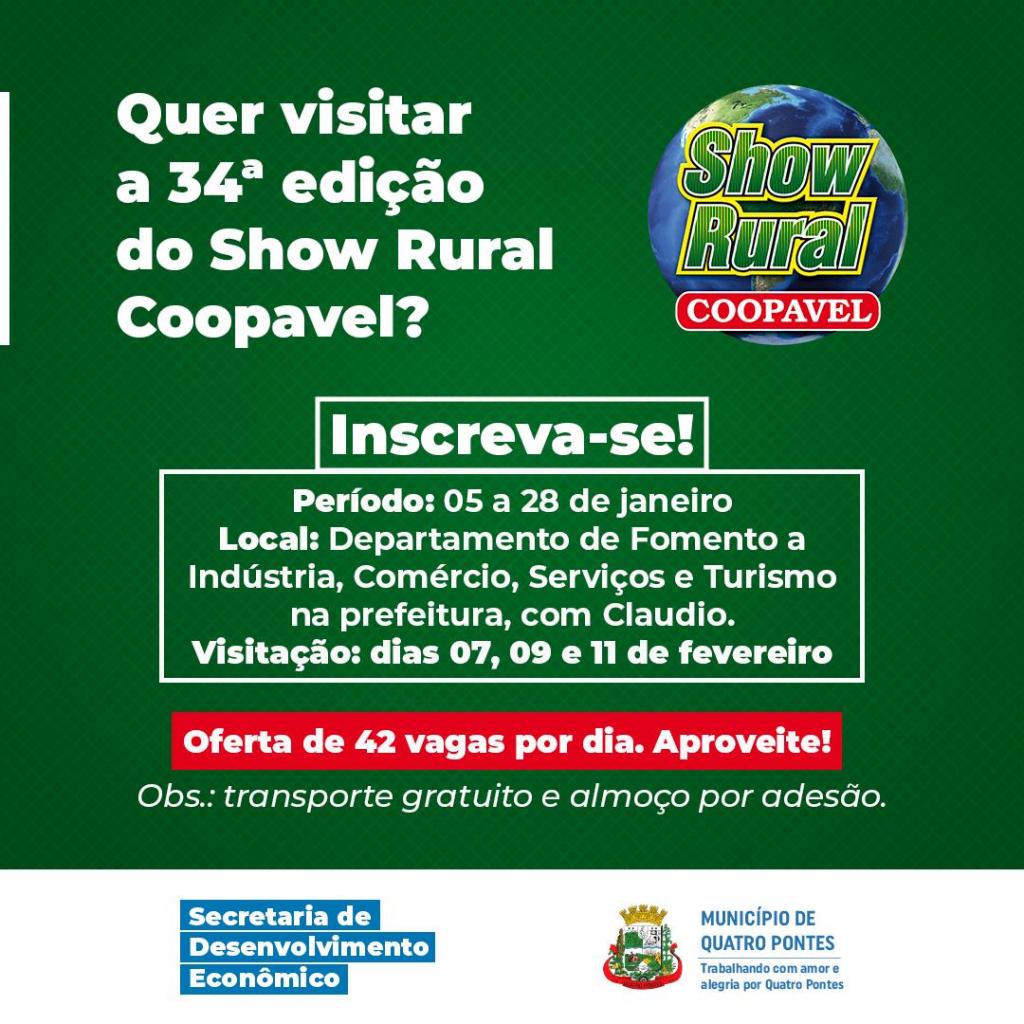 A Prefeitura de Quatro Pontes, por meio da Secretaria de Desenvolvimento Econômico, abriu hoje (5) as inscrições para visitação ao 34º Show Rural Coopavel, que ocorrerá de 07 a 11 de fevereiro, em Cascavel. Sem custo, as reservas devem ser realizadas junto ao Departamento de Fomento a Indústria, Comércio, Serviços e Turismo na prefeitura, com Claudio Nisczak, apresentando RG, CPF, comprovante de residência atualizado e número para contato. O prazo finaliza no próximo dia 28, mas pode encerrar antes se todas as vagas forem preenchidas.