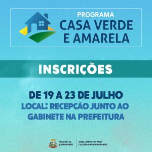 Na próxima semana, de segunda (19) a sexta-feira (23), a Prefeitura de Quatro Pontes estará com inscrições abertas ao Programa Casa Verde e Amarela, propondo a edificação das 31 unidades habitacionais remanescentes da primeira convocação. Tais casas populares também integrarão o Residencial Bem Viver, conjunto habitacional social que estará localizado em frente aos bairros Itatiaia e Alvorada.