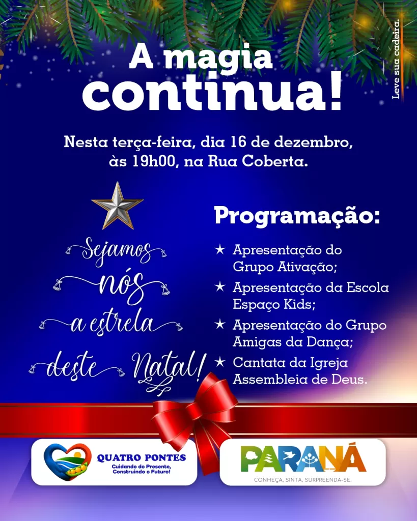 Com o tema “Sejamos nós a estrela deste Natal”, a Administração Municipal convida as famílias de Quatro Pontes a prestigiarem as apresentações, valorizando os artistas locais e fortalecendo o espírito de confraternização neste período de fim de ano.