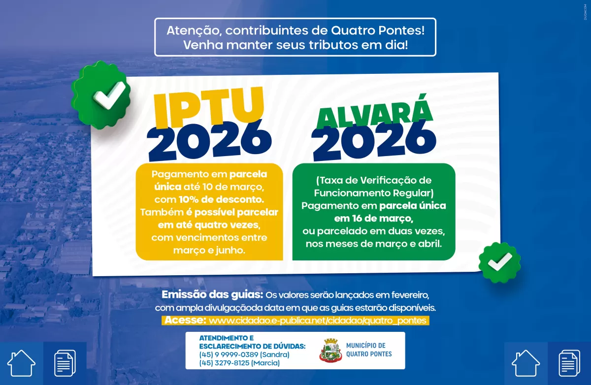 A Prefeitura Municipal de Quatro Pontes, por meio da Secretaria Municipal de Finanças, informa aos contribuintes os prazos para pagamento dos tributos municipais referentes ao exercício de 2026, conforme estabelece o Decreto nº 223/2025.