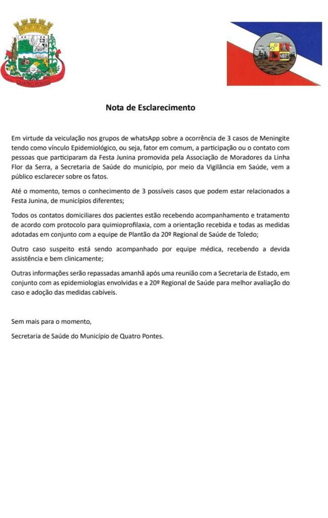 Diante da repercussão, via WhatsApp, sobre possíveis casos de meningite meningocóccica a partir da participação em festa junina promovida pela Associação de Moradores da Linha Flor da Serra, a Prefeitura de Quatro Pontes emitiu uma nota de esclarecimento, na qual informa ter conhecimento de três possíveis casos de meningite que podem estar relacionados a festas juninas de três diferentes municípios.