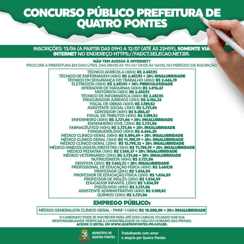 A Prefeitura de Quatro Pontes, através da Secretaria de Administração e Gabinete, lançou na segunda-feira (5), no Diário Oficial, o concurso público 001/2023 e o processo seletivo público 001/2023 – emprego público, com a oferta de 33 cargos. Os editais 075/2023 e 076/2023 podem ser acessados no site do município (clique aqui), clicando em ‘Concursos’, na barra lateral da página inicial.