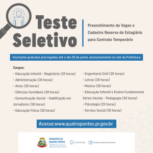 A Prefeitura de Quatro Pontes prorrogou até o próximo domingo, dia 20, o prazo de inscrições ao teste seletivo 01/2021 de prova escrita, visando o preenchimento de vagas e cadastro reserva de estagiário para contrato temporário. Elas são gratuitas e devem ser feitas exclusivamente no site da prefeitura (www.quatropontes.pr.gov.br). O candidato deve acessar a aba cidadão, em seguida protocolo cidadão, preencher os campos solicitados e anexar RG e CPF via protocolo.