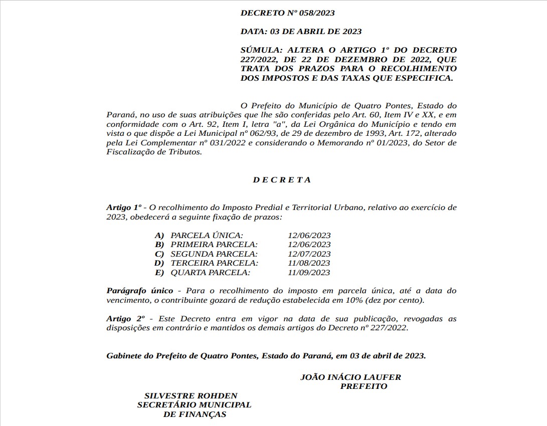 A Prefeitura de Quatro Pontes, por meio da Secretaria de Finanças, prorrogou para o mês de junho os vencimentos do recolhimento do Imposto Predial Territorial Urbano (IPTU) relativo ao exercício de 2023.