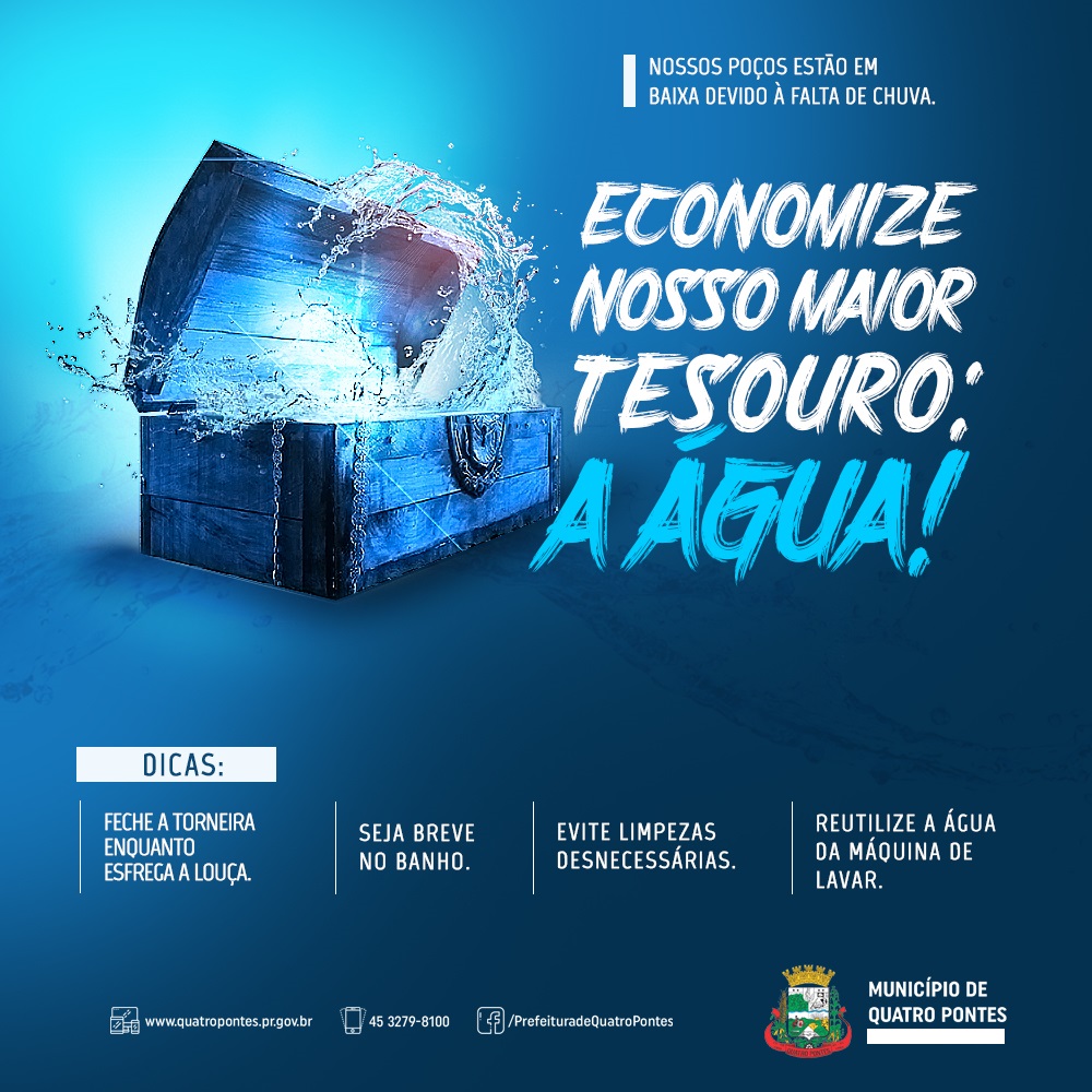 Por causa da falta de chuvas, a Prefeitura de Quatro Pontes, por meio da Secretaria de Obras, Urbanismo e Transportes, solicita aos consumidores que economizem água. O período de estiagem exige algumas medidas de prevenção, como evitar lavar calçadas, pátios e carros, tomar banhos mais curtos, cuidado com vazamentos, usar a descarga com consciência, reaproveitar a água, entre tantas outras.
