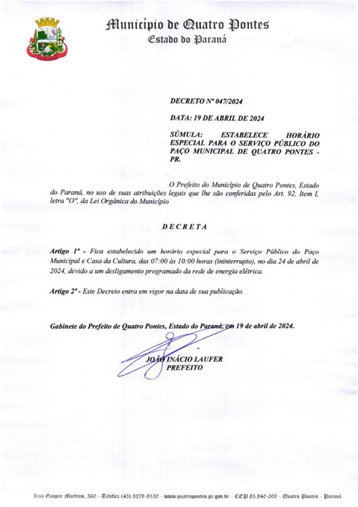 Em razão do desligamento de energia elétrica programado pela Copel, a Prefeitura de Quatro Pontes terá horário especial de atendimento quarta-feira (24), conforme o decreto nº 047/2024, de sexta-feira (19).