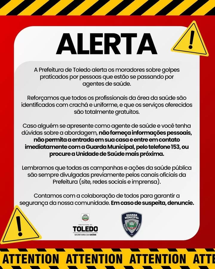 A Prefeitura de Toledo alerta a comunidade sobre a ocorrência de golpes praticados por pessoas que estão se passando por agentes de saúde do município. Todos os servidores da área da saúde são devidamente identificados, com crachá e uniforme, e que os serviços prestados à população são inteiramente gratuitos.