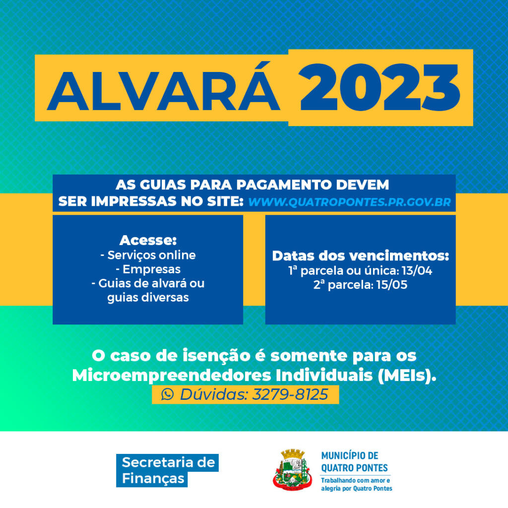 A Taxa de Verificação de Funcionamento Regular das Empresas de Produção, Comércio, Indústria e de Prestação de Serviços (alvará) 2023 de Quatro Pontes tem o vencimento da primeira parcela ou única no dia 13 de abril. As guias estão disponíveis somente em formato on-line, pois a prefeitura, por meio da Secretaria de Finanças, não imprime mais carnês.