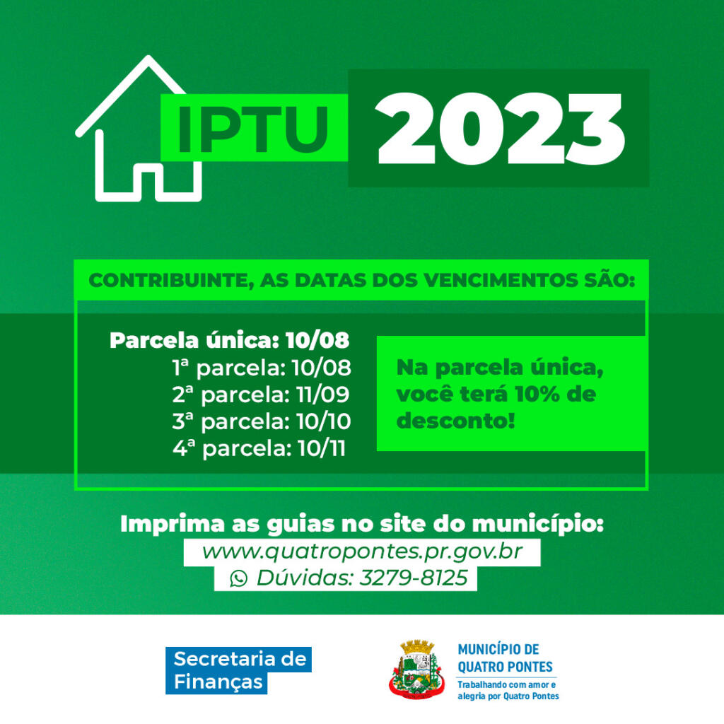 No dia 10 de agosto, vence a primeira parcela ou única do Imposto Predial Territorial Urbano (IPTU) 2023 de Quatro Pontes. Até a data do vencimento o contribuinte gozará de redução estabelecida em 10%. A Secretaria de Finanças já fez a liberação dos boletos.
