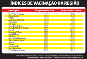 Na 20ª Regional de Saúde, enumera o diretor, Diamante do Oeste tem 78,1% de aplicação da segunda dose, Quatro Pontes 53,5% e Guaíra 49,2%, sendo os municípios com maior percentual de vacinação de segundas doses. Já os municípios com menor percentual de vacinação da segunda dose na Regional são, de acordo com o vacinômetro, Ouro Verde do Oeste, com 28,1%, Nova Santa Rosa, com 28,9%, e São José das Palmeiras, com 29,5%.