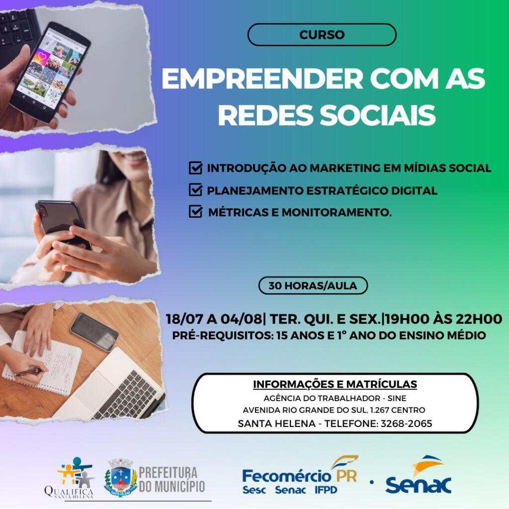 O curso “Empreender com as redes sociais” terá 30 horas/aula, com previsão de início para julho. São 20 vagas. Para participar precisa ter no mínimo 15 anos de idade e escolaridade mínima 1º do Ensino Médio.