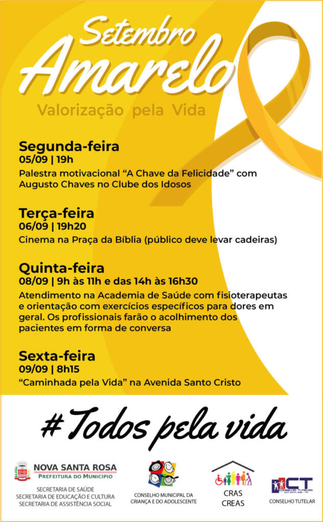 O município de Nova Santa Rosa terá uma semana de programação em alusão ao Setembro Amarelo “Valorização pela Vida”. A programação acontece através de uma parceria entre a Prefeitura de Nova Santa Rosa, Secretaria de Educação e Cultura, Secretaria de Assistência Social, Secretaria de Saúde, Conselho Tutelar, CRAS, CREAS e Conselho Tutelar. Confira: