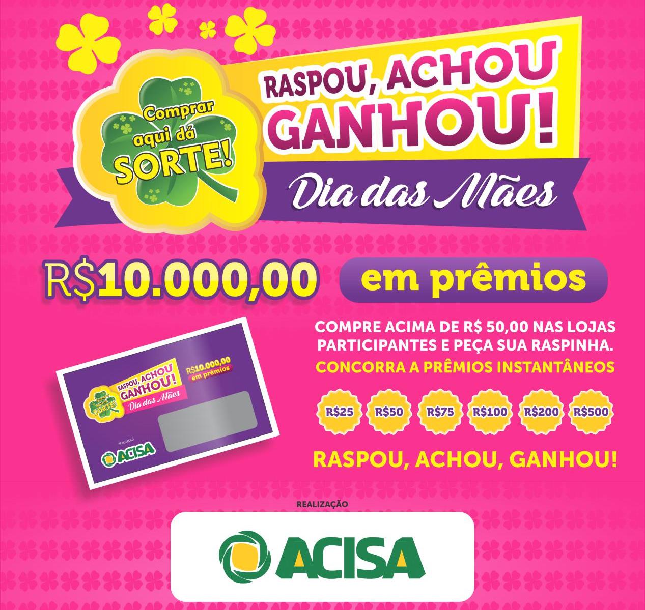 Finalizada a primeira semana da Campanha Comprar Aqui dá Sorte – Dia das Mães, a promoção continua até o final do mês. Até agora já foram concedidos R$ 2 mil em vales compras. Até o final do mês serão distribuídos mais R$ 8 mil. Ao todo são R$ 10 mil em premiação por intermédio de 148 raspinhas. Os prêmios são instantâneos e valor deve ser gasto em mercadorias ou serviços na empresa onde o cliente for contemplado. As premiações variam de R$ 25 a R$ 500.