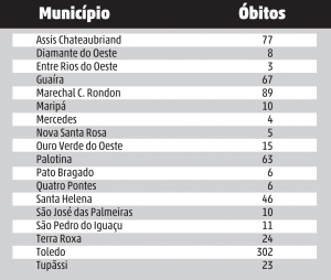 Segundo o relatório de ontem (20) da Secretaria de Estado da Saúde (Sesa), os três municípios da 20ª Regional de Saúde – Toledo que mais registraram óbitos foram Toledo, com 302 mortes, seguido de Assis Chateaubriand, com 77 casos, e Marechal Rondon, com 89 óbitos.