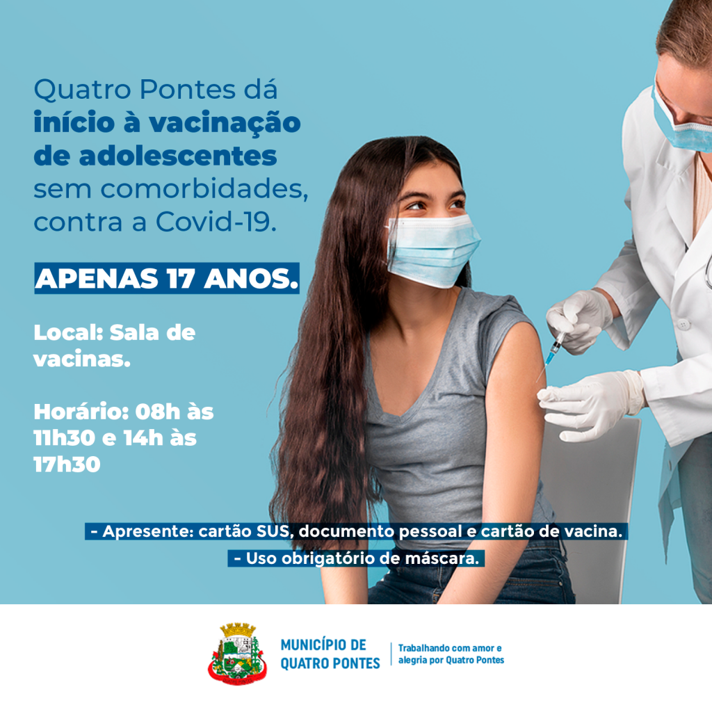 Quatro Pontes já iniciou a vacinação contra a Covid-19 de adolescentes de 17 anos sem comorbidades. Porém, os mesmos devem estar acompanhados pelos pais e/ou responsáveis para receber a dose. Além disso, é necessário apresentar o Cartão SUS, um documento pessoal e a carteira de vacinas, caso contrário serão dispensados. O uso de máscara também é obrigatório.