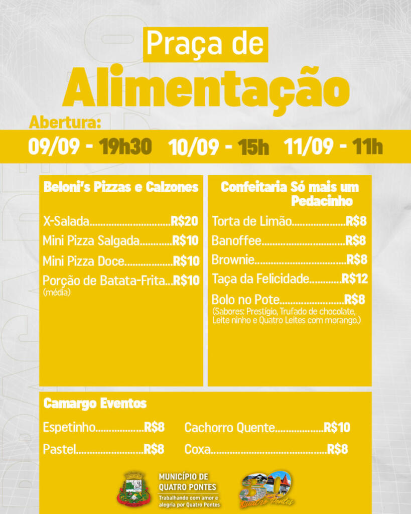 A praça de alimentação, ofertará grande variedade ao público. Nesta sexta-feira, a abertura será às 19h30; amanhã (10), às 15 horas; e no domingo (11), às 11 horas. Ela ficará ao lado do Centro de Eventos Seno José Lang.