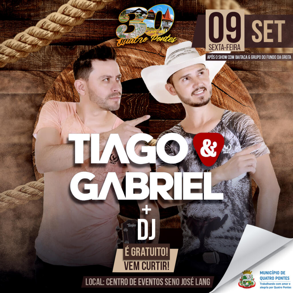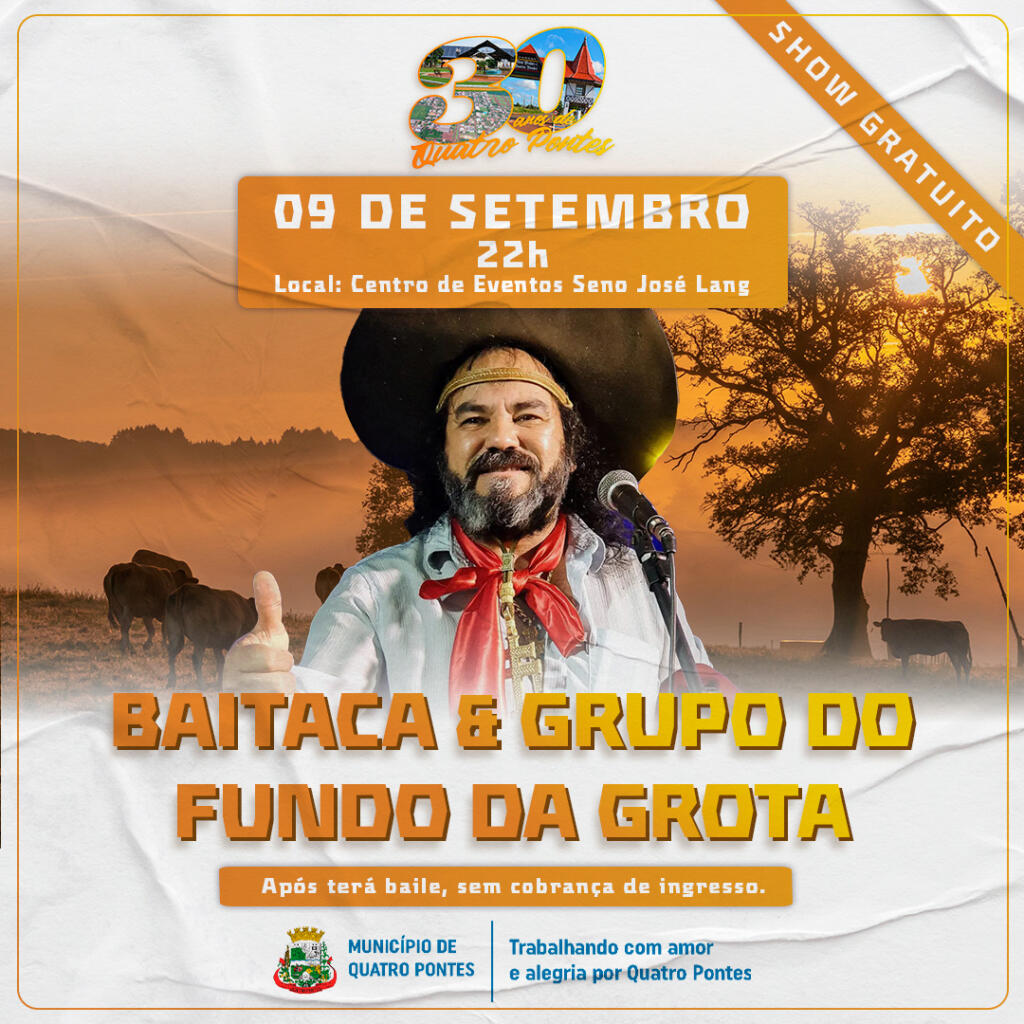 Ainda nesta sexta-feira (09), Quatro Pontes recebe o grande show de Baitaca & Grupo do Fundo da Grota. A atração é gratuita. O show acontecerá no Centro de Eventos Seno José Lang, com início marcado para as 22 horas.