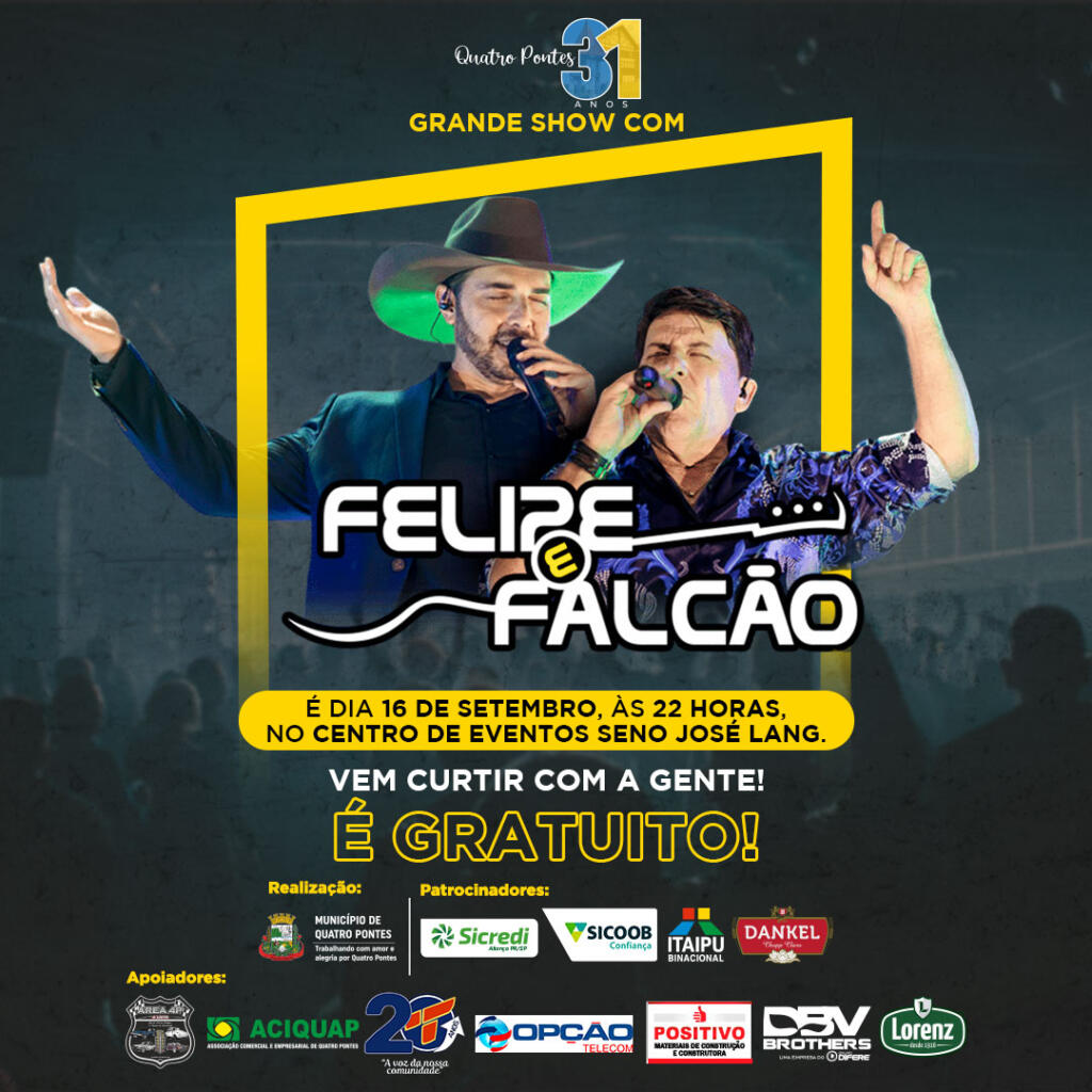 Quatro Pontes celebrará o 31º aniversário de emancipação político-administrativa em grande estilo neste mês. O dia 16 será marcado pelo show nacional com a dupla Felipe e Falcão, no Centro de Eventos Seno José Lang. A atração é gratuita e iniciará a partir das 22 horas.