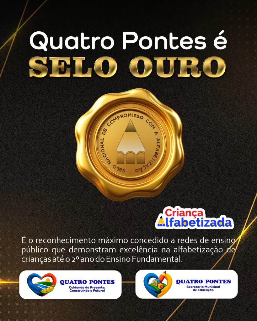 Com a conquista do Selo Ouro, Quatro Pontes reafirma o compromisso da administração municipal com a qualidade da educação pública, o fortalecimento da alfabetização nos anos iniciais e a construção de uma base sólida para o desenvolvimento educacional das crianças do município.