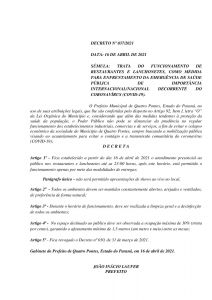 Considerando que além das medidas tendentes à proteção da saúde da população, o Poder Público de Quatro Pontes não pode se distanciar da prudência no regular funcionamento dos estabelecimentos industriais, comercias e de serviços, a fim de evitar o colapso econômico da sociedade, sempre buscando a mobilização pública, visando o acautelamento para evitar o contágio e a transmissão comunitária do coronavírus (Covid-19), o decreto nº 037/2021 foi publicado ontem (16), no Diário Oficial, com novas medidas para o funcionamento de restaurantes e lanchonetes.