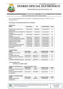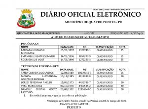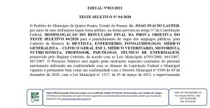 Ontem (04), a Prefeitura de Quatro Pontes publicou o edital nº 023/2021, no Diário Oficial, com a homologação do resultado final da prova objetiva do teste seletivo nº 04/2020, para o preenchimento de vagas dos empregos públicos, para cadastro de reserva de dentista, enfermeiro, fonoaudiólogo, médico generalista – clínico geral ESF 1, médico veterinário, motorista, nutricionista, professor, psicólogo e técnico de enfermagem, promovido pelo regime celetista.