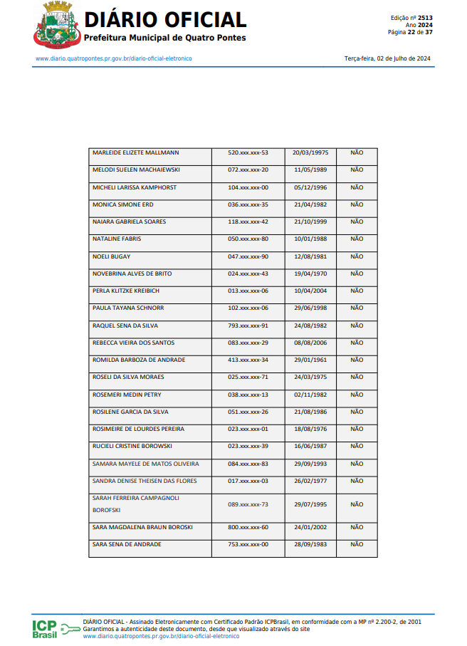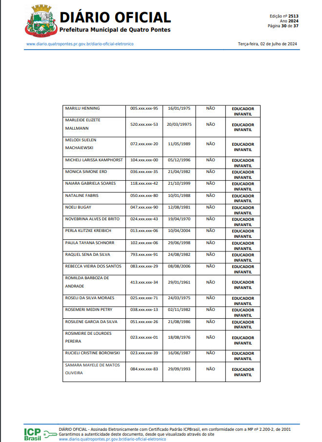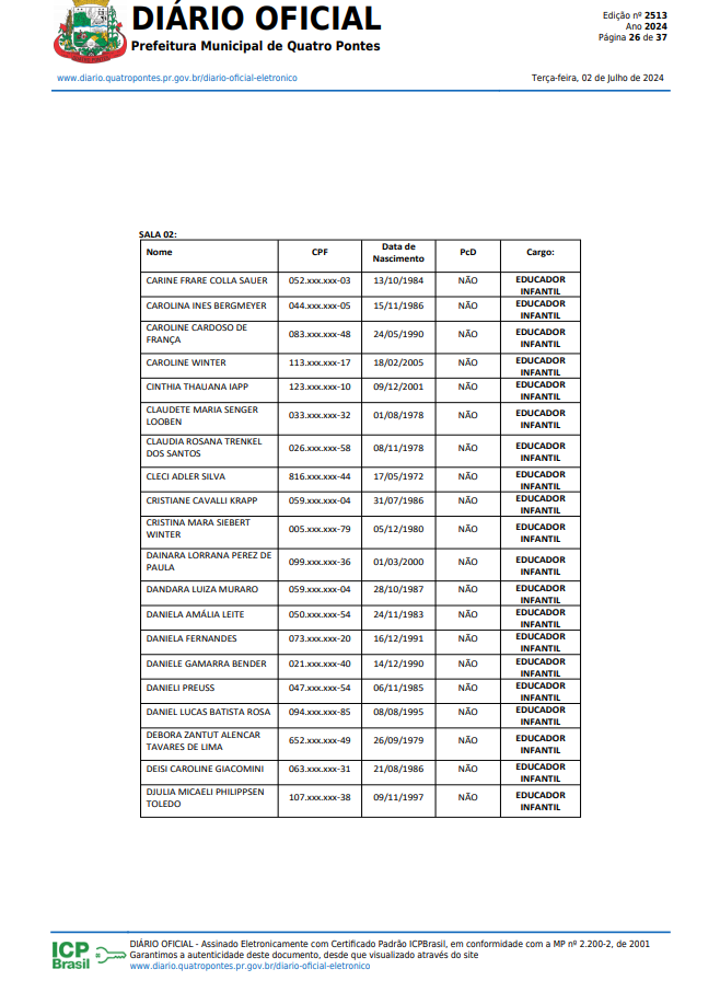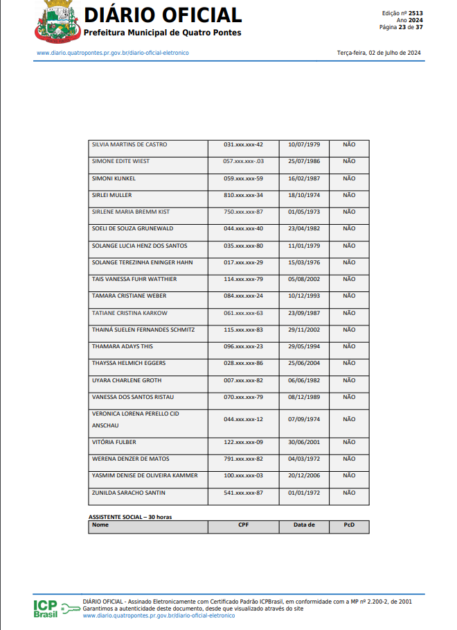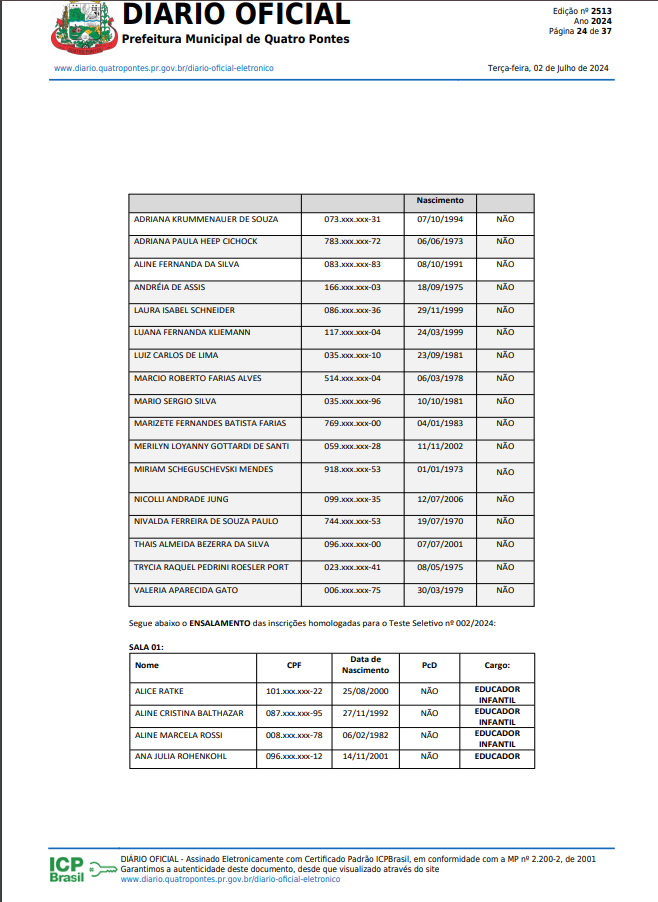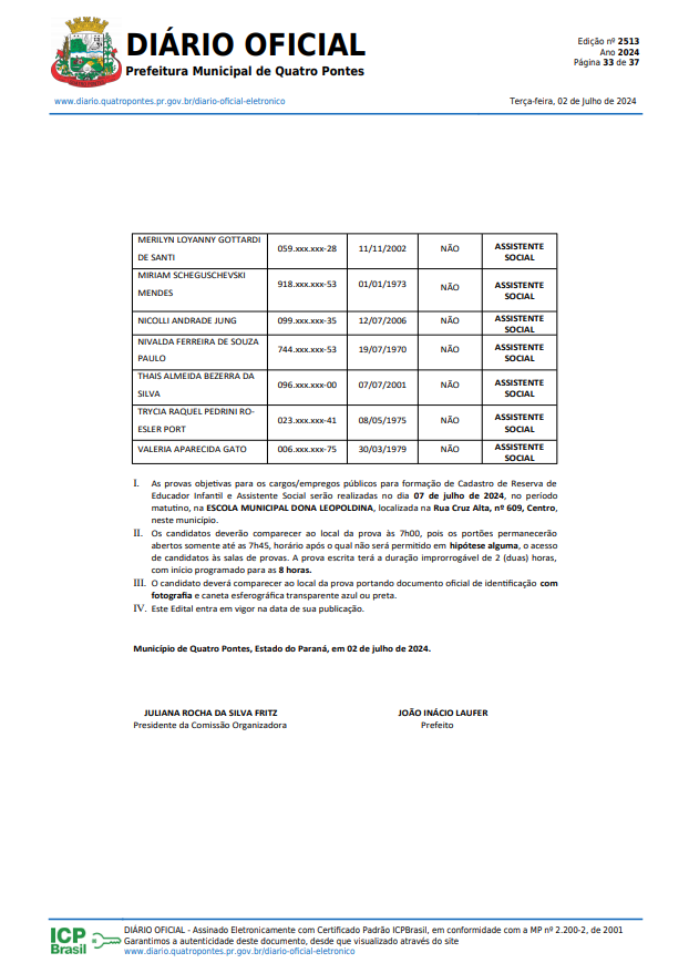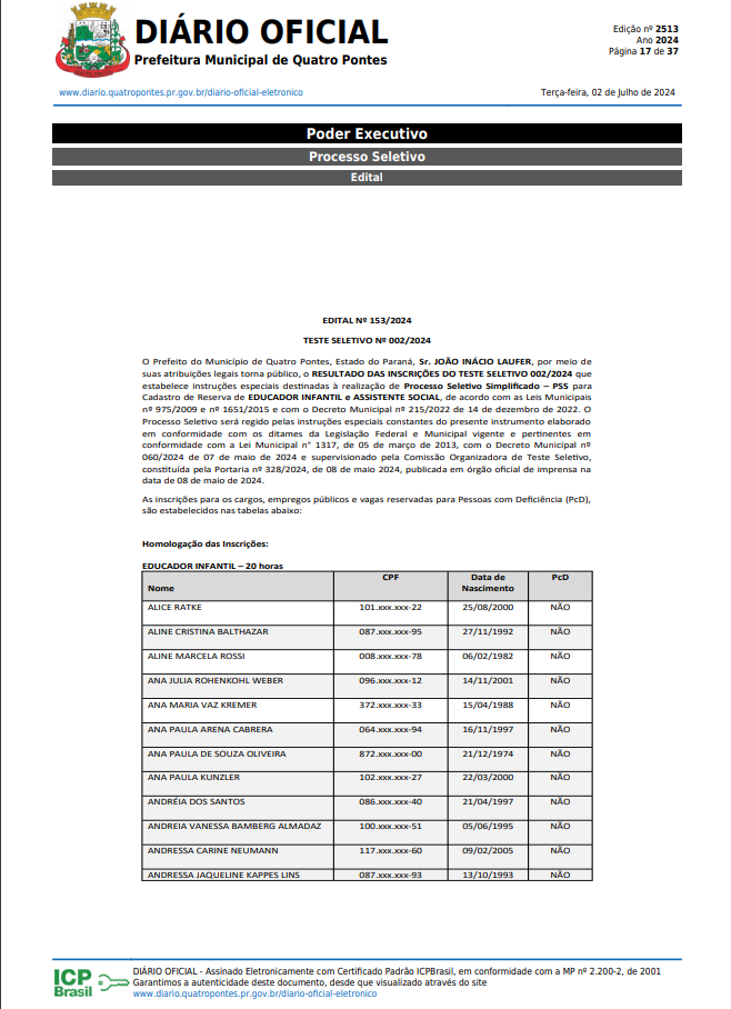 A Prefeitura de Quatro Pontes publicou na data de ontem (2), no Diário Oficial, o edital nº 153/2024 com a homologação das inscrições e o ensalamento para o Teste Seletivo nº 2/2024 para cadastro de reserva de Assistente Social (30 horas) e Educador Infantil (20 horas).