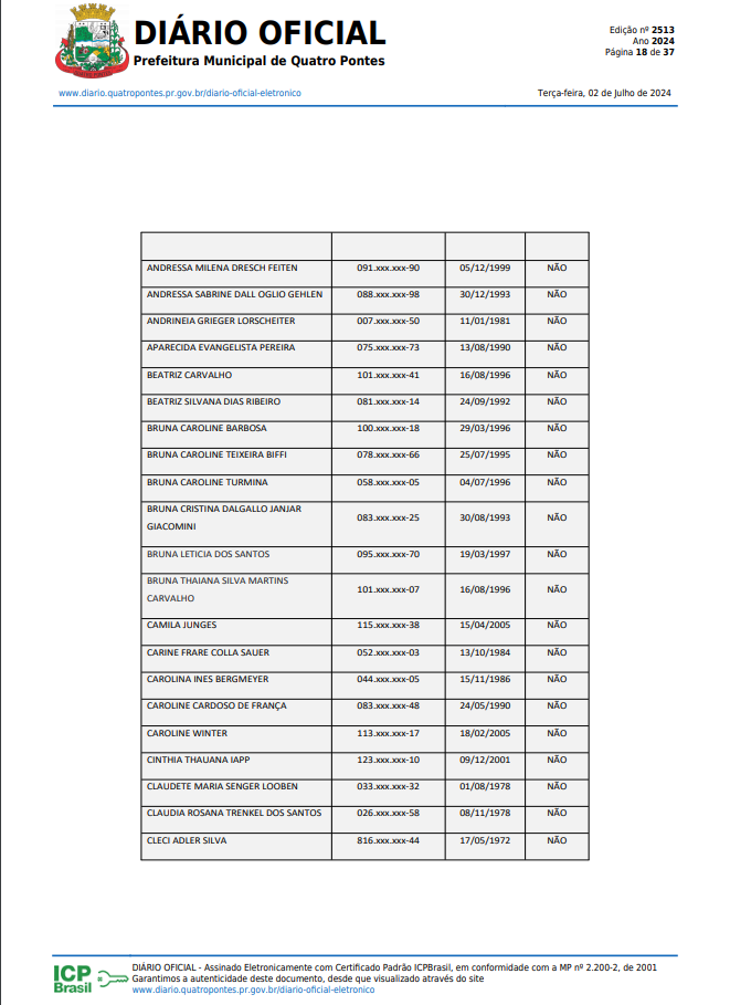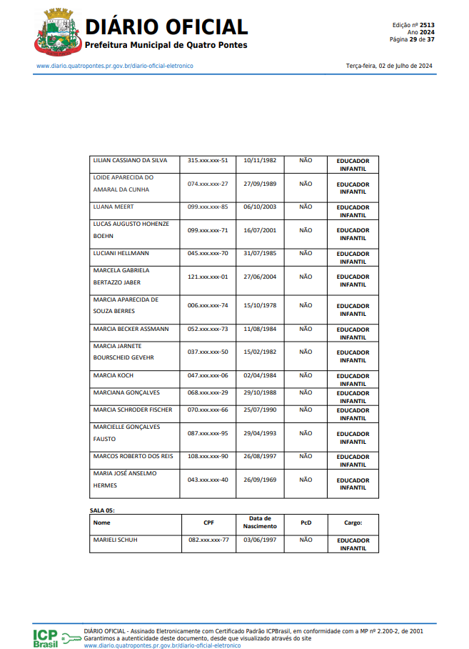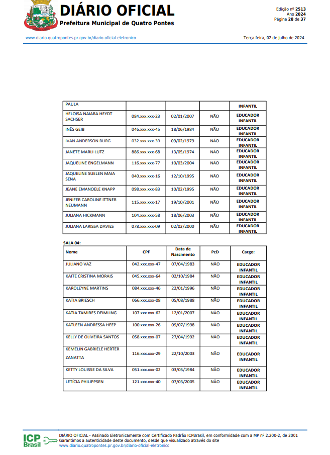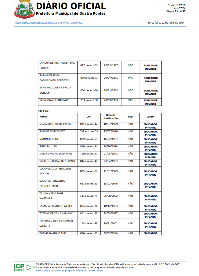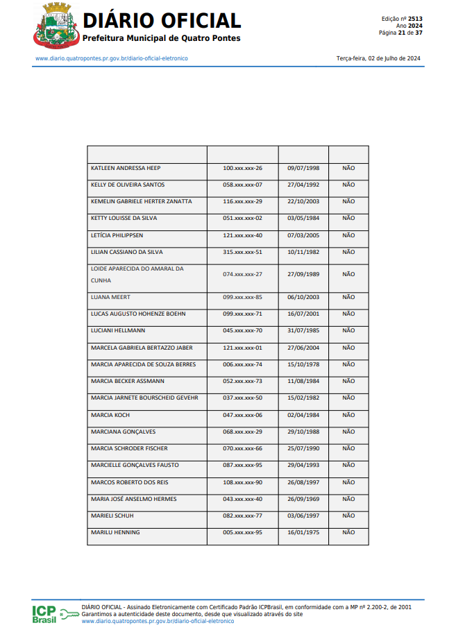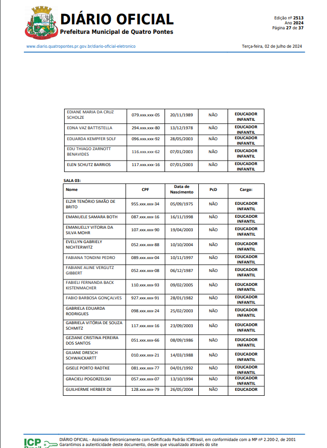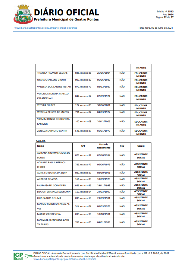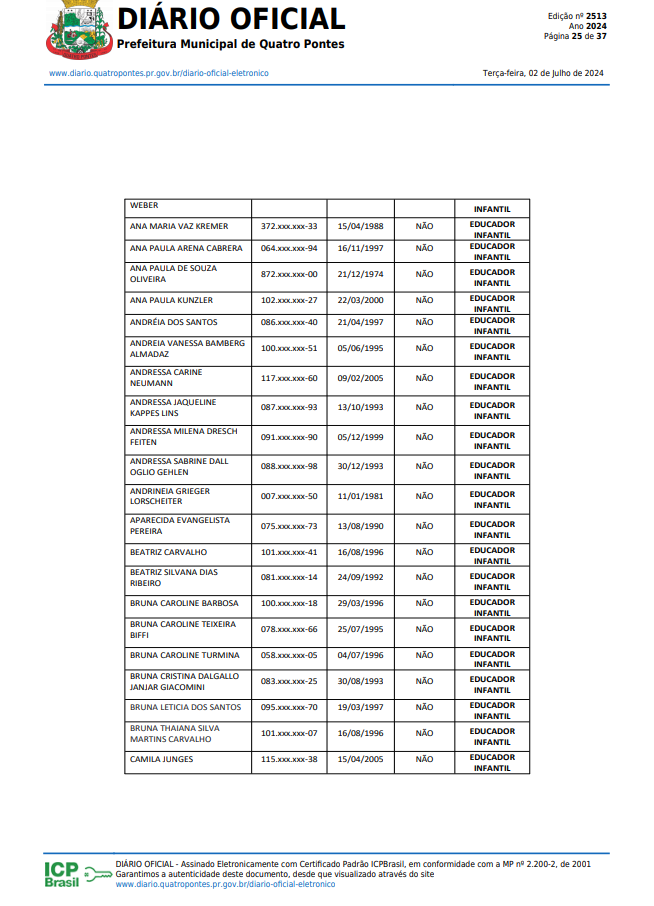 A Prefeitura de Quatro Pontes publicou na data de ontem (2), no Diário Oficial, o edital nº 153/2024 com a homologação das inscrições e o ensalamento para o Teste Seletivo nº 2/2024 para cadastro de reserva de Assistente Social (30 horas) e Educador Infantil (20 horas).