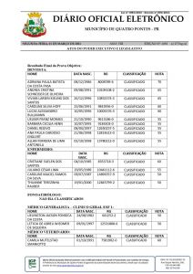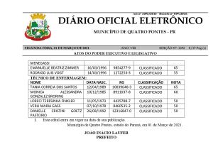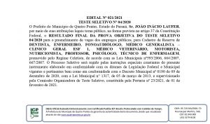 Ontem (1º), a prefeitura de Quatro Pontes publicou o edital nº 021/2021 no Diário Oficial, com o resultado final da prova objetiva do teste seletivo nº 04/2020, para o preenchimento de vagas dos empregos públicos, para cadastro de reserva de dentista, enfermeiro, fonoaudiólogo, médico generalista – clínico geral ESF 1, médico veterinário, motorista, nutricionista, professor, psicólogo e técnico de enfermagem, promovido pelo regime celetista.
