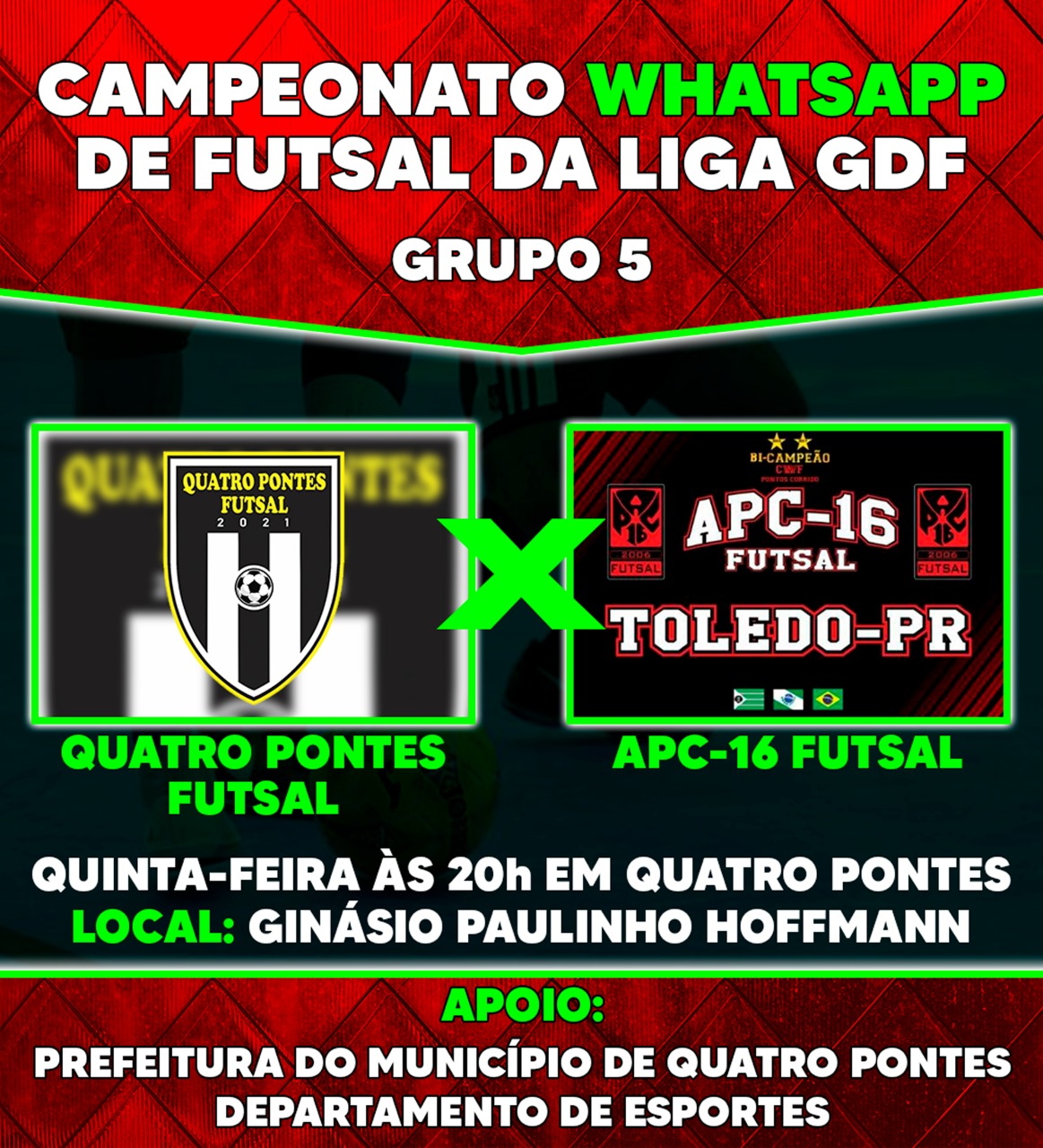 Com o apoio do Departamento de Esportes, a equipe Quatro Pontes Futsal estréia amanhã (10) no Campeonato WhatsApp da Liga GDF. O time enfrentará APC-16 Futsal, no Ginásio de Esportes Paulinho Hoffmann, às 20 horas.