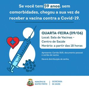 A Secretaria de Saúde de Quatro Pontes inicia hoje (09) a vacinação contra a Covid-19 de mais um público. A 20ª Regional de Saúde de Toledo repassou 70 primeiras doses da AstraZeneca/Fiocruz para a imunização da população em geral sem comorbidades, iniciando com as pessoas de 59 anos. A vacinação deste público está programada para iniciar às 18 horas, na Sala de Vacinas do Centro de Saúde, mediante a distribuição de senhas. Para tomar a dose é necessário apresentar o Cartão SUS, documento pessoal e a carteira de vacinas.
