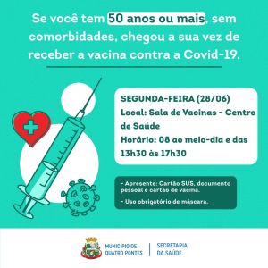 A Secretaria de Saúde de Quatro Pontes recebeu no sábado (26) mais uma remessa de primeiras doses contra a Covid-19, repassadas pela 20ª Regional de Saúde de Toledo. Ao todo, são 48 doses da Pfizer/BioNTech para a população em geral de 59 a 18 anos. Em vista disso, hoje (28) está sendo dada continuidade à vacinação, contemplando as pessoas de 50 anos ou mais sem comorbidades.