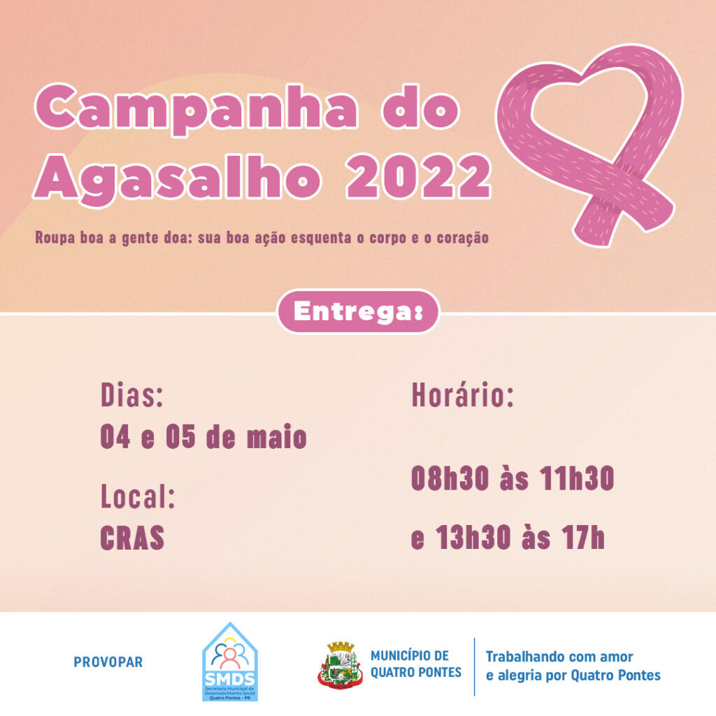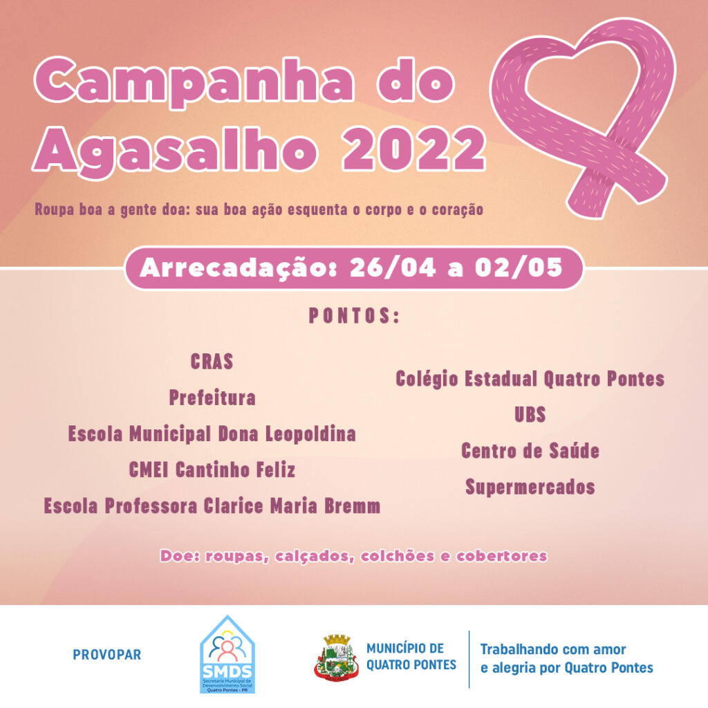 Com o tema “Roupa boa a gente doa: sua boa ação esquenta o corpo e o coração”, a Campanha do Agasalho 2022 foi lançada nesta terça-feira (26) em Quatro Pontes, sendo uma iniciativa do Provopar com a Secretaria de Desenvolvimento Social e o Centro de Referência de Assistência Social (CRAS).