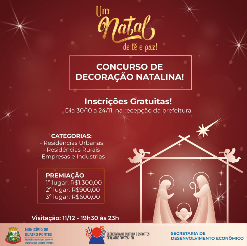 A fim de incentivar a população em transformar o município em um cartão de visitas, despertando o espírito e a magia que há nas tradições natalinas, as Secretarias de Cultura e Esportes e de Desenvolvimento Econômico de Quatro Pontes lançam o Concurso de Decoração Natalina ‘Um Natal de fé e paz’.