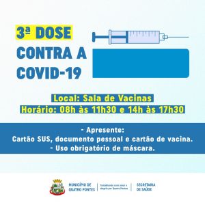A Secretaria de Saúde de Quatro Pontes informa que tem disponível a dose de reforço (3ª dose) para a imunização contra a Covid-19, atendendo os idosos com 60 anos ou mais, imunossuprimidose profissionais da saúde. Os três públicos podem procurar a Sala de Vacinas, no Centro de Saúde, até às 11h30 e das 14 às 17h30.