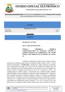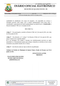 O Executivo de Quatro Pontes determinou a prorrogação das medidas para proteção da população e enfrentamento da Covid-19 contidas no decreto nº 066/2021 até o dia 30, conforme o decreto nº 077/2021, publicado na última sexta-feira (18) no Diário Oficial.