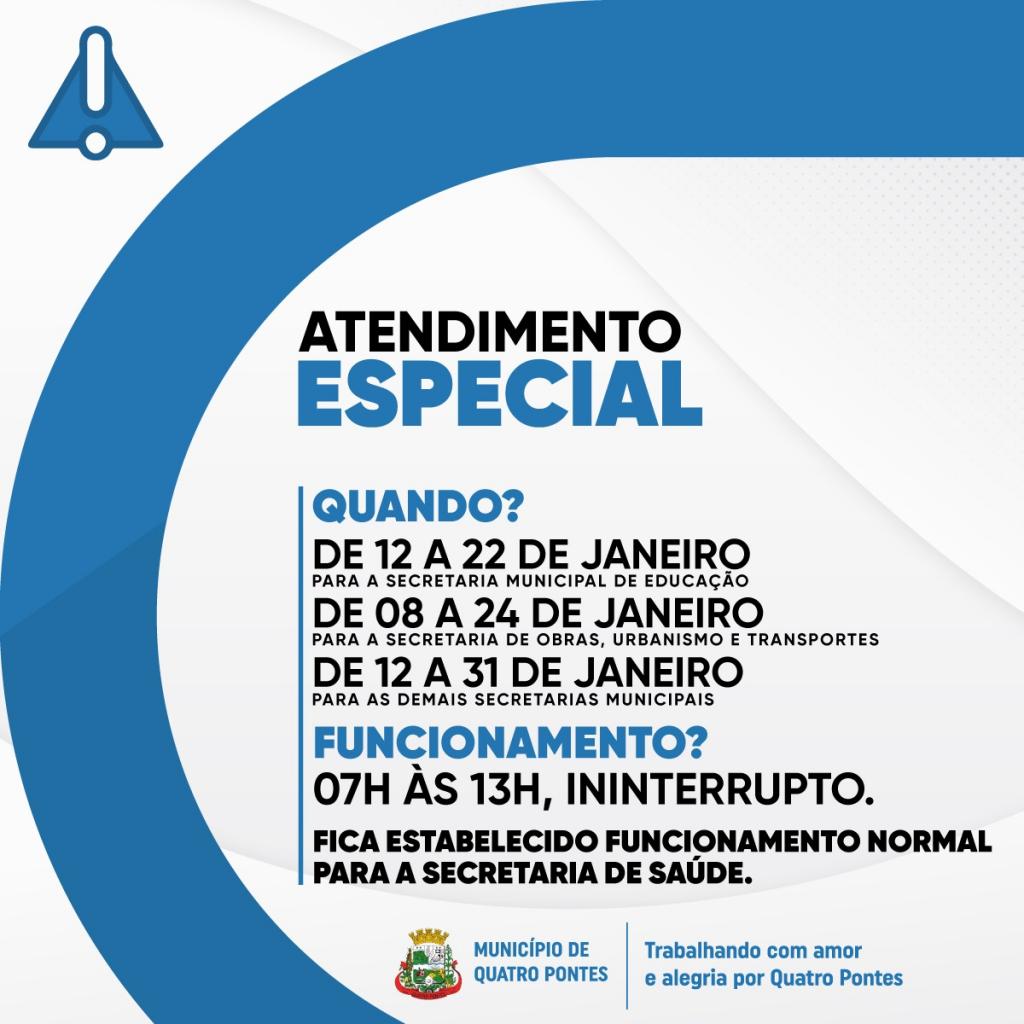 A Prefeitura de Quatro Pontes e as Secretarias de Educação e de Obras, Urbanismo e Transportes estão com horário especial de atendimento ao serviço público municipal neste mês, de acordo com os decretos nº 001/2024 e nº 003/2024, publicados no Diário Oficial.