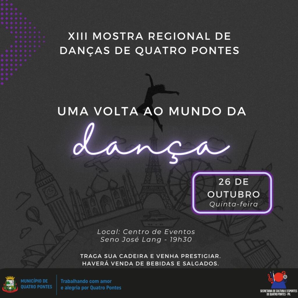 O Centro de Eventos Seno José Lang de Quatro Pontes será palco nesta quinta-feira (26) da 13ª Mostra Regional de Danças, intitulada ‘Uma volta ao mundo da dança’. O evento é organizado pela Secretaria de Cultura e Esportes e iniciará a partir das 19h30, não sendo de caráter competitivo. Pede-se que o público leve cadeira para melhor prestigiar. Também haverá venda de bebidas e salgados.