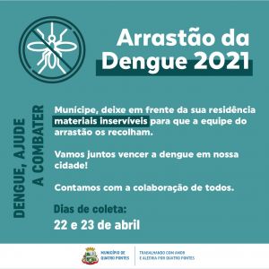 A Secretaria de Saúde, por meio do Setor de Controle de Endemias, e a Secretaria de Obras, Urbanismo e Transportes de Quatro Pontes promoverão na quinta (22) e sexta-feira (23) um arrastão da dengue. Solicita-se que todos os munícipes se programem e organizem, deixando em frente às suas residências todo e qualquer objeto inservível que possa acumular água, pois um caminhão passará recolhendo.