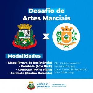 O Centro Poliesportivo Seno José Lang de Quatro Pontes será palco, no próximo dia 20, do Desafio de Artes Marciais, evento organizado pelo Departamento de Esportes e a Secretaria de Desenvolvimento Social, por meio do projeto social de karatê. O desafio será entre os alunos dos projetos sociais de Quatro Pontes e São José das Palmeiras, nas modalidades de mapu – prova de resistência, combate Low Kick, combate Poit Fight e combate Bastão Colorido. As disputas iniciarão às 14 horas.