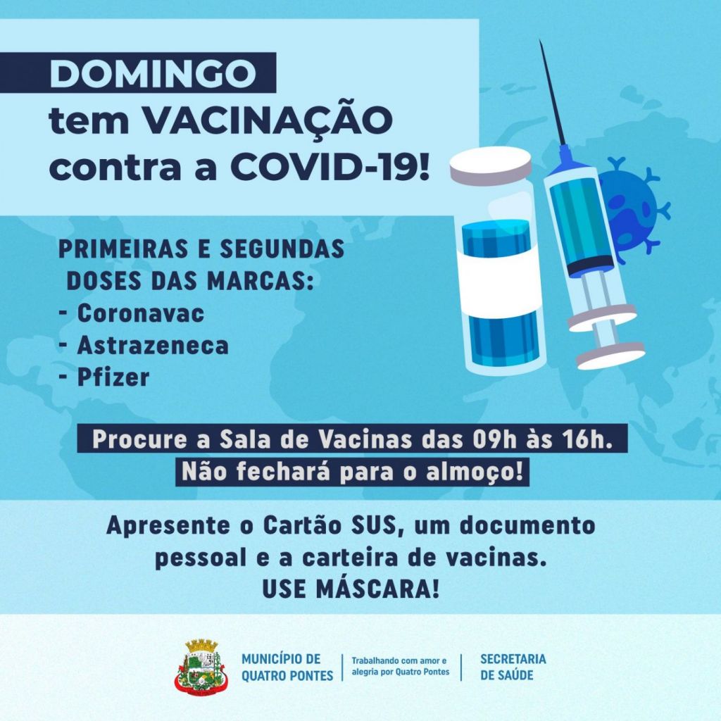 A Secretaria de Saúde de Quatro Pontes realizará no domingo (26) a vacinação contra a Covid-19, com a aplicação de primeiras e segundas doses das marcas Pfizer, Coronavac e Astrazeneca. Os munícipes deverão procurar a Sala de Vacinas, no Centro de Saúde, das 09 horas às 16 horas, sendo que não fechará para o almoço.